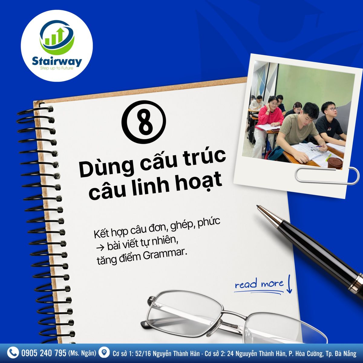 Kết hợp câu đơn – ghép – phức → tăng điểm Grammar và giúp câu tự nhiên hơn.