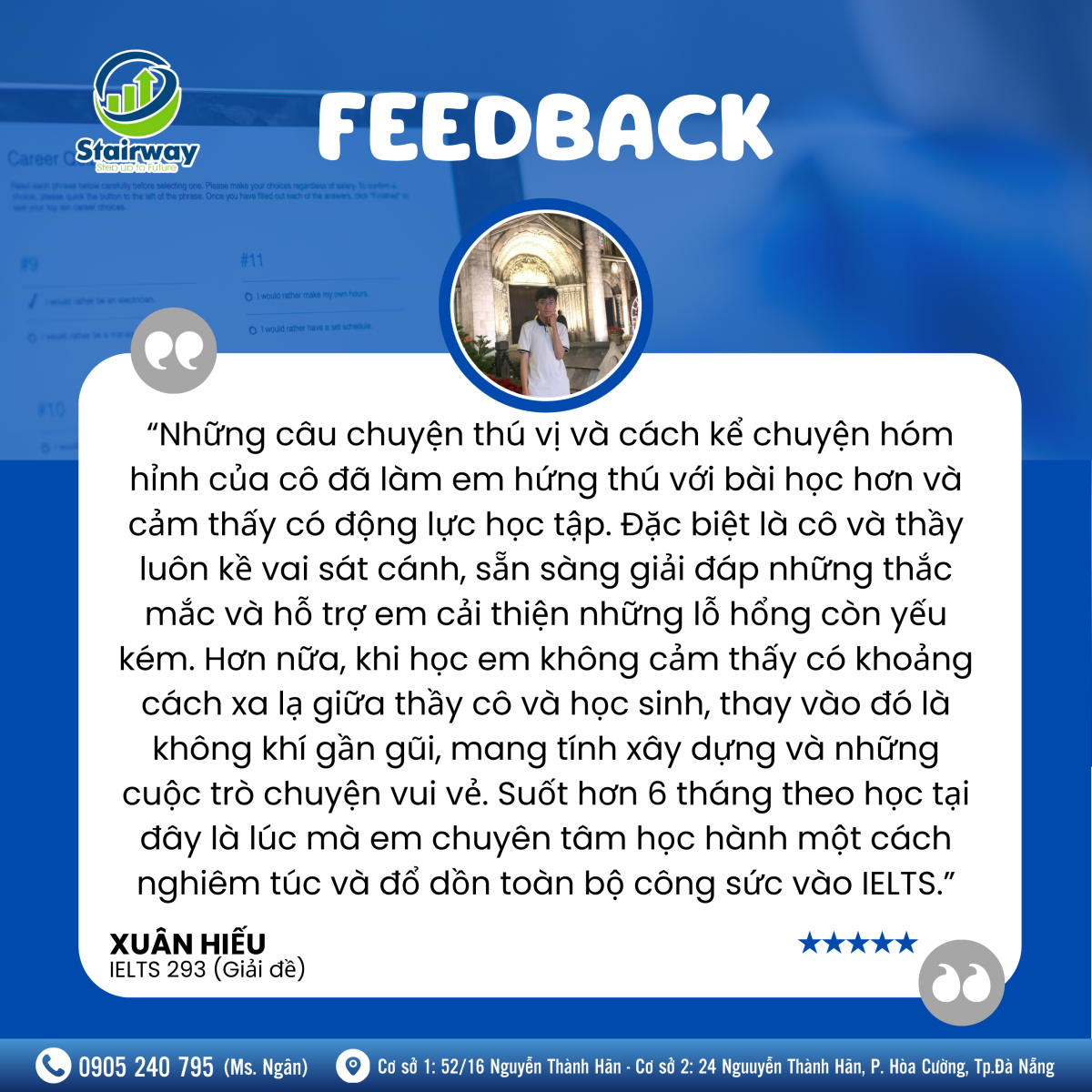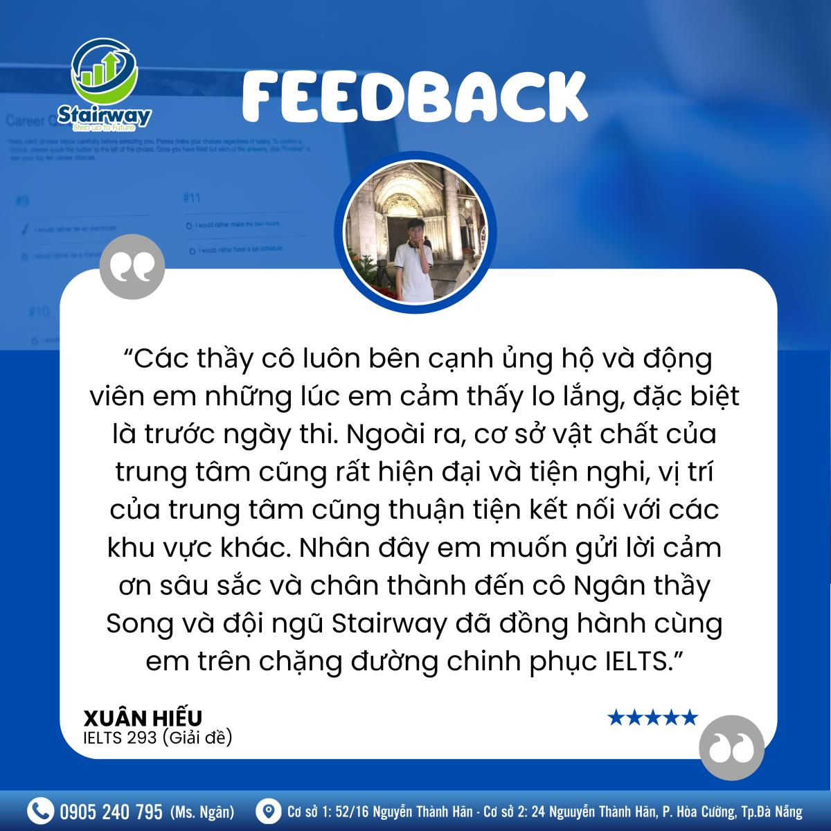 Hiếu gửi gắm lời cảm ơn sâu sắc đến cô Ngân, thầy Song và đội ngũ STAIRWAY đã luôn đồng hành, hỗ trợ hết mình trong hành trình chinh phục IELTS.