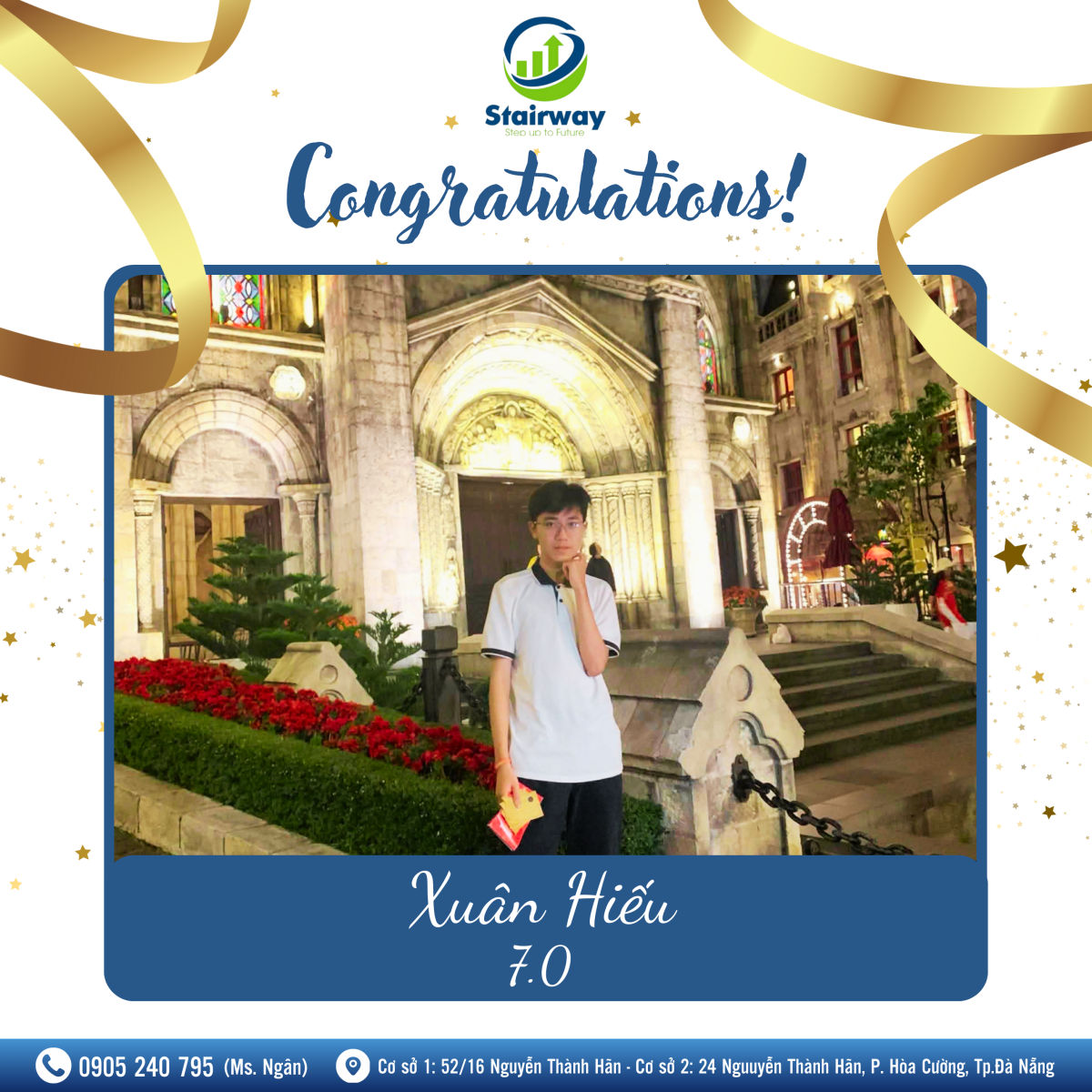 STAIRWAY vô cùng tự hào và chúc mừng Cao Xuân Hiếu với số điểm 7.0 đầy xứng đáng. Chúc bạn tiếp tục mở ra thật nhiều cơ hội, tiếp tục phát triển bản thân mạnh mẽ trong thời gian tới!