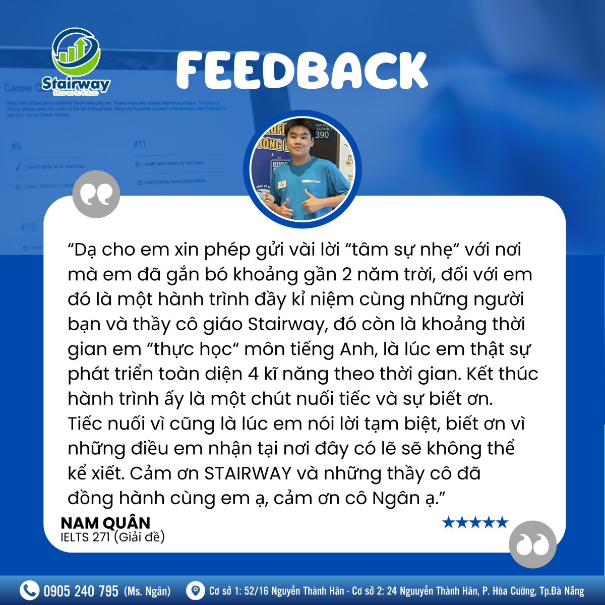 Gần 2 năm gắn bó cùng STAIRWAY, Quân đã không chỉ xây dựng nền tảng vững chắc mà còn phát triển toàn diện cả 4 kỹ năng qua từng giai đoạn học. Đây là khoảng thời gian mà bạn thực sự “sống cùng tiếng Anh”, học bằng sự nghiêm túc và trưởng thành qua từng buổi học.