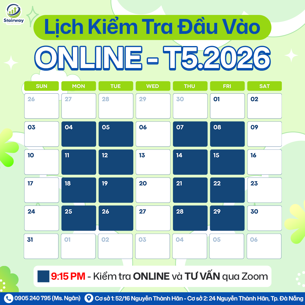 Cả nhà ơi, lịch test đầu vào tháng 05/2026 nhà STAIRWAY đã chính thức lên sóng rồi đây!